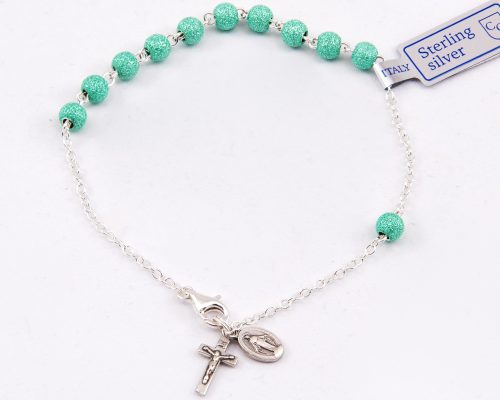 This rosary features a Miraculous Medal with the image of Virgin Mary on the front. The grains are oval-shaped and measure 4×6 mm.