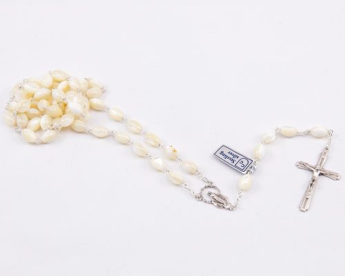 Hand-made genuine Mother of Pearl (Nacre) & Sterling Silver Precious Rosary, rhodium plated finish, 4×6 mm oval-shaped mother of pearl beads, “Virgin Mary” Sterling Silver Centerpiece and “Classical Design” Sterling Silver Crucifix.